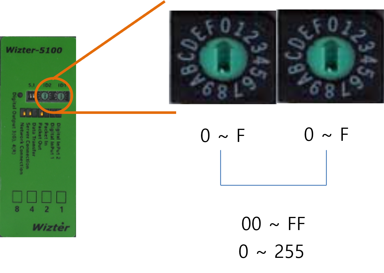 - WIzter-5100의 ID 설정은 단말기 전면 회전형 스위치 두 개를 이용하여 00 ~ FF (0~255) 범위 내에서 중복되지 않게 설정하여야 합니다.